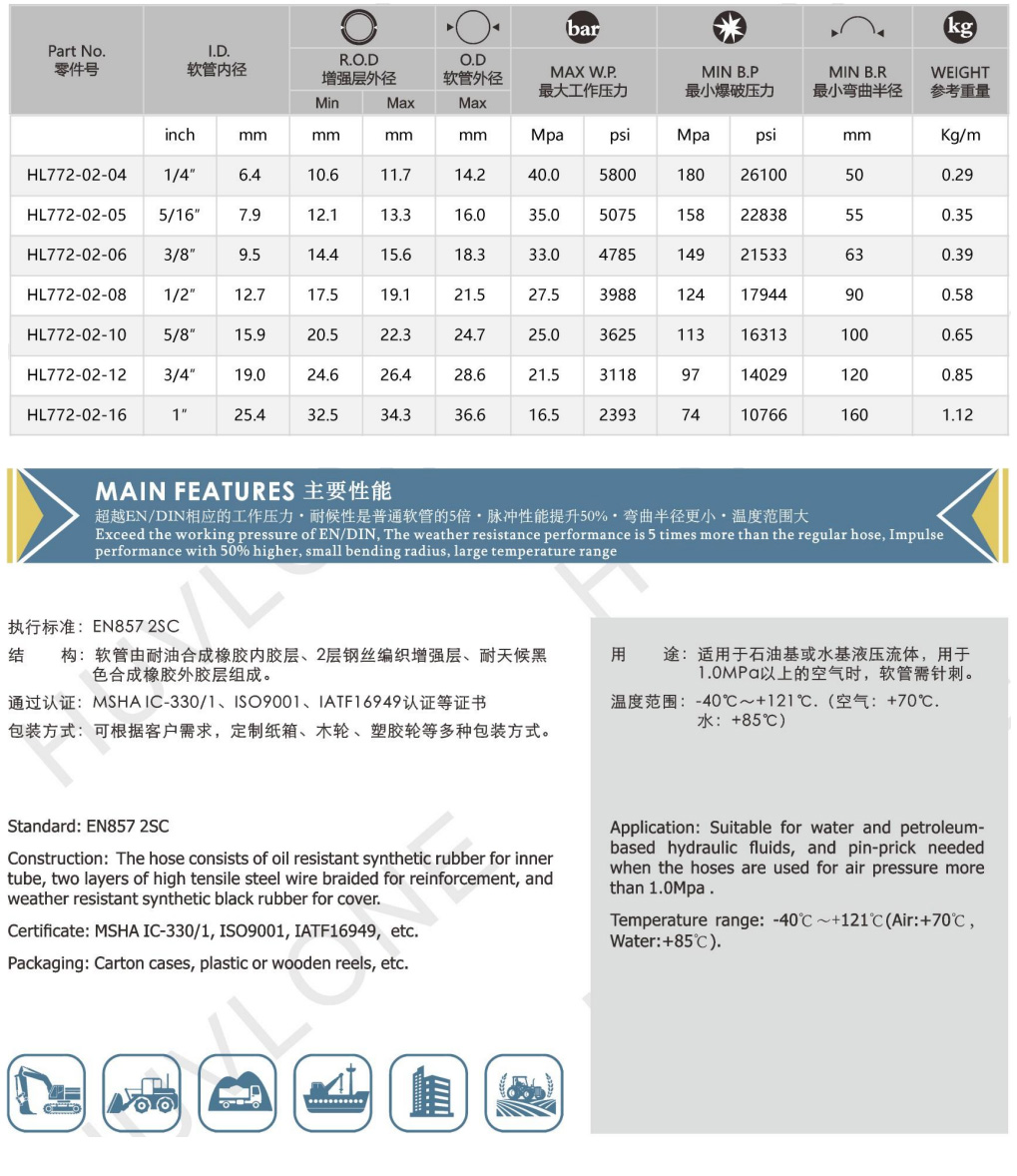符合/超越DIN EN857 2SC二層鋼絲編織橡膠軟管