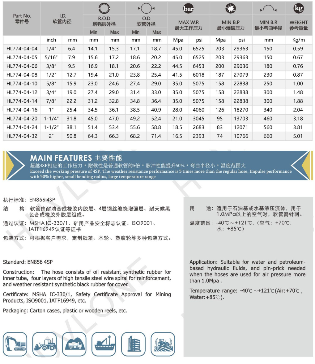 符合/超越DIN EN856 4SP四層鋼絲纏繞橡膠軟管