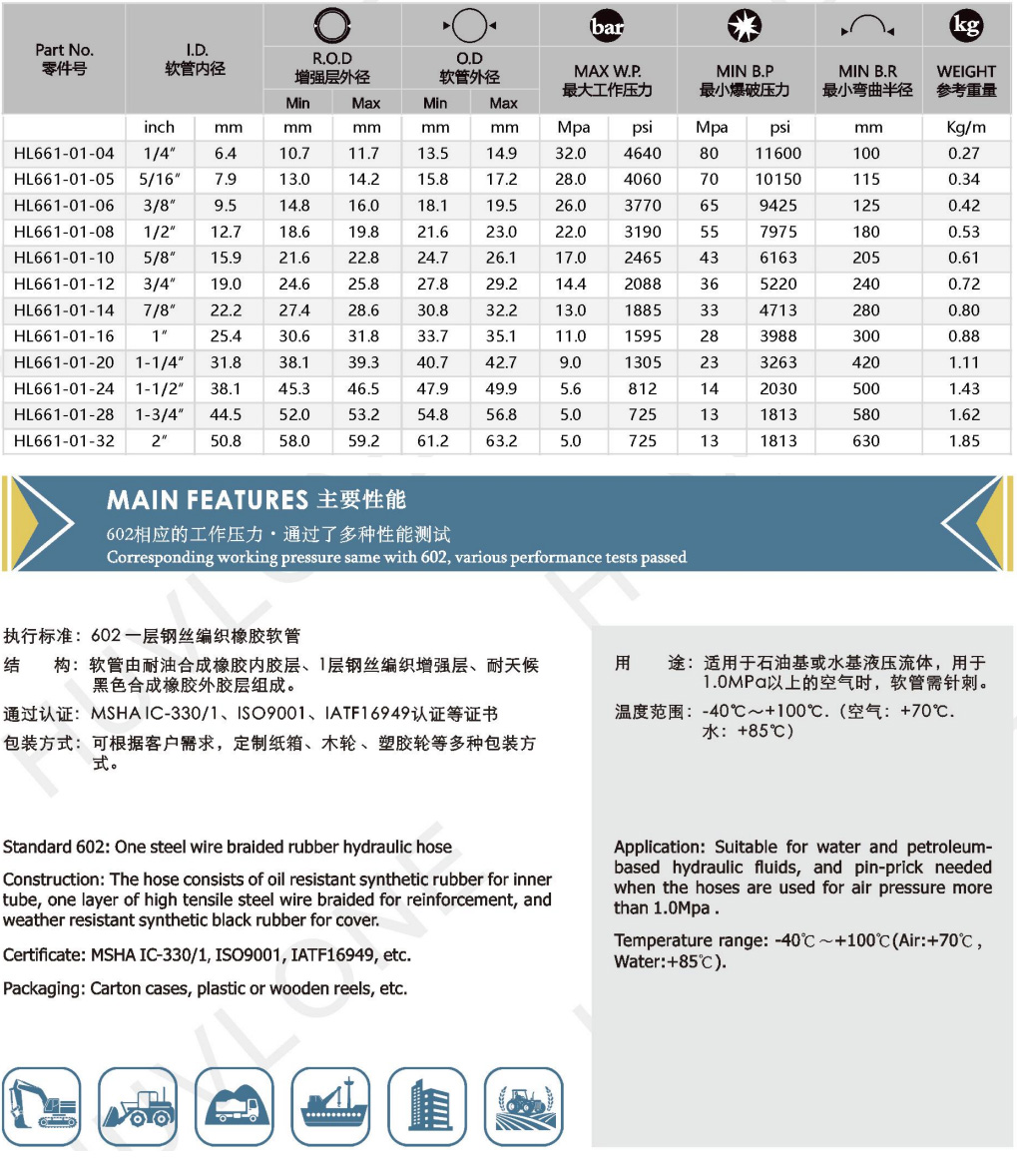 Product Usage:Suitable for water and petroleum-based hydraulic fluids,and pin-prick needed when the hoses are used for air pressure more than 1.0Mpa .