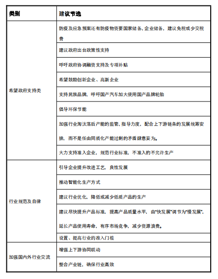 期望政策方面:取消天然橡膠進(jìn)口關(guān)稅、降低制造業(yè)稅收、解決物流運輸通道受限的情況、政府機構(gòu)因疫情影響延遲交貨的違約責(zé)任劃清、減少行政類管控等;