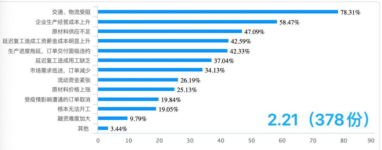 “這一突出棘手的問題,也由 2 月 12 日占比 78.4%的企業(yè)反饋,到十日后 2 月 21 日占比降為 78.31%,到問卷截止時,這一占比為78.2%。從這組數(shù)據(jù)上可以看出:隨著有序復(fù)工的推進(jìn),國家和地方在交通運輸、物流上出臺了相應(yīng)的政策支撐,使交通、物流受阻得以