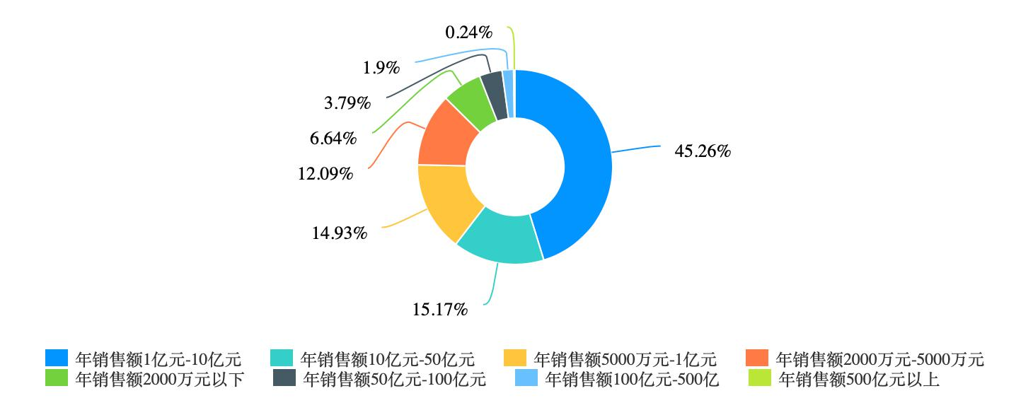 根據(jù)分會及專委會細(xì)分行業(yè)不同,企業(yè)經(jīng)營規(guī)模有差異,橡膠行業(yè) 422 家參與調(diào)研答卷的企業(yè)中,45.26%的企業(yè)年銷售額在 1億-10 億元區(qū)間內(nèi);15.17%的企業(yè)年銷售額在 10 億-50 億元區(qū)間內(nèi);14.93%的 企業(yè)年銷售額在 5000 萬-1 億元區(qū)間內(nèi),其余如圖 3 所示。