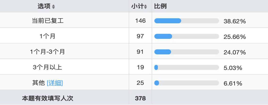 企業(yè)承受期限調(diào)查項中,按照填報時間進(jìn)度,當(dāng)時時點的復(fù)工率 由 2 月 12 日填報 250 份問卷時的 32%,到十日后填報 378 份問卷 時上升到 38.62%,到 2 月底復(fù)工率達(dá)到填報總數(shù) 40.28%,反映了 橡膠行業(yè)企業(yè)自強不息,逐漸努力恢復(fù)生產(chǎn)經(jīng)營。