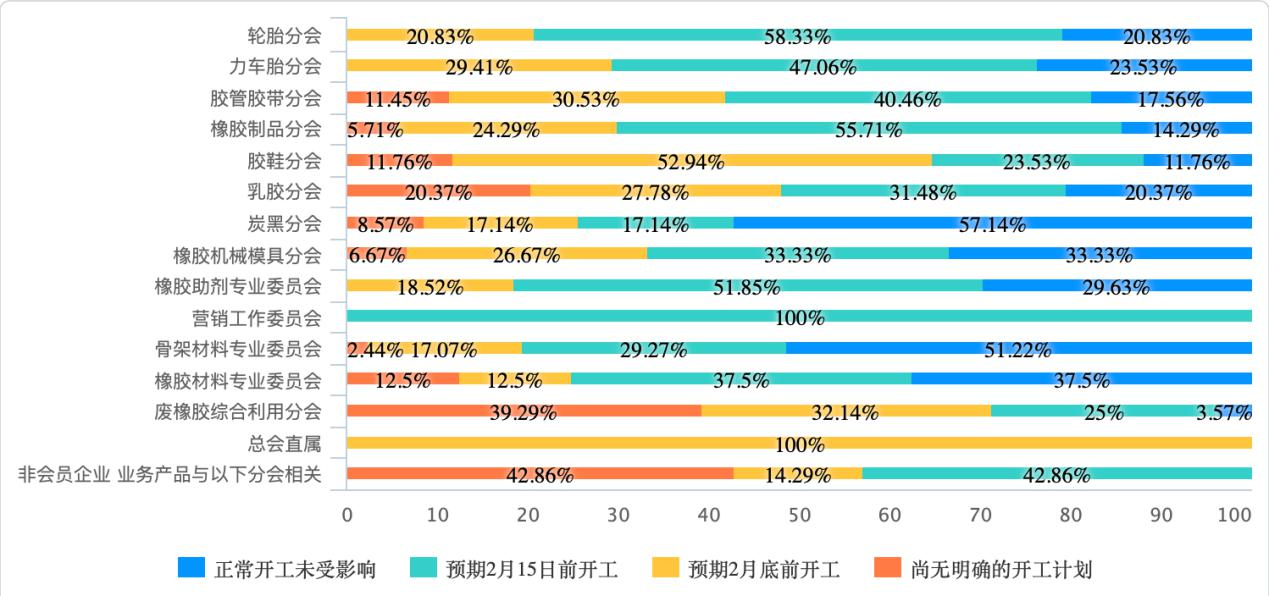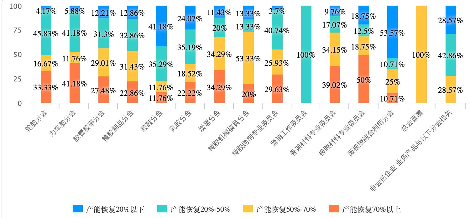 另外,從下圖 7 我們可以看出按照橡膠行業(yè)各細(xì)分行業(yè)看,我們的各分會及專委會會員的 2 月底前的產(chǎn)能恢復(fù)情況,產(chǎn)能情況恢復(fù)較好的有橡膠材料企業(yè)、骨架材料鋼簾線行業(yè)、炭黑行業(yè)等,需要說明的是受限于各分會及專委會的填報數(shù)量不同,企業(yè)類型不同,所以此項情況僅供參考。